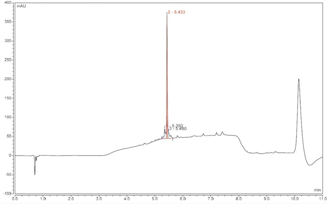 Figure 3. Analytical RP-HPLC of crude target peptide (optimised synthesis), tR 5.433 min.